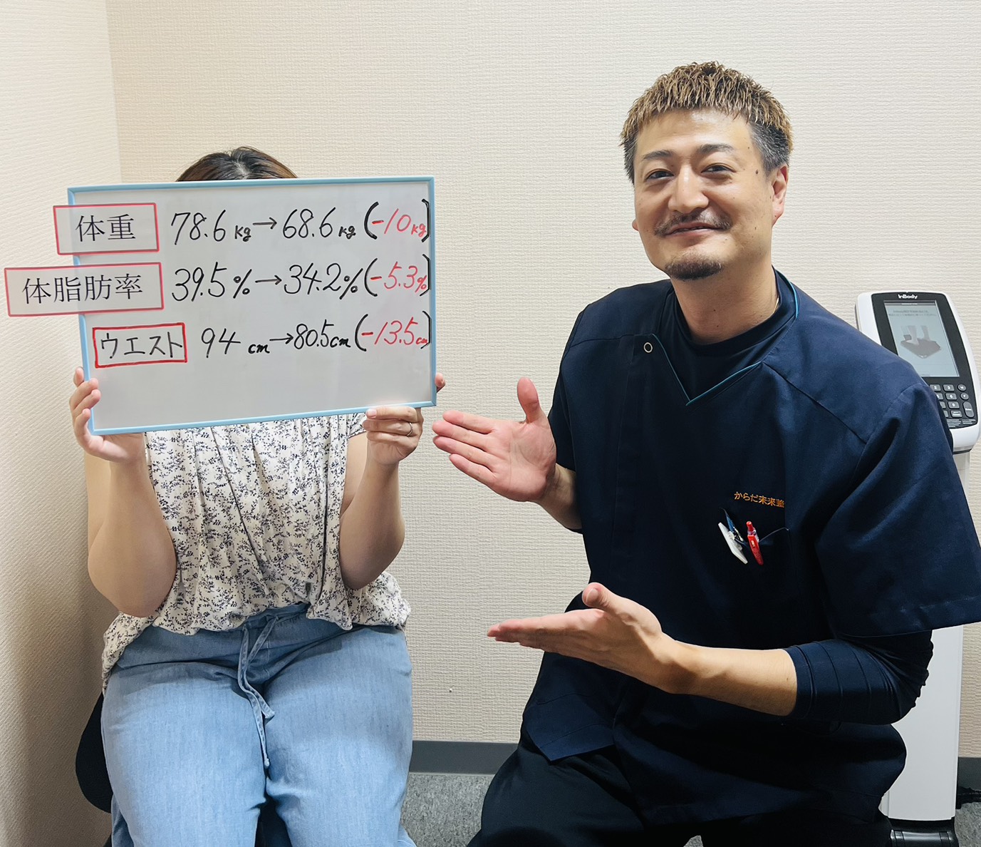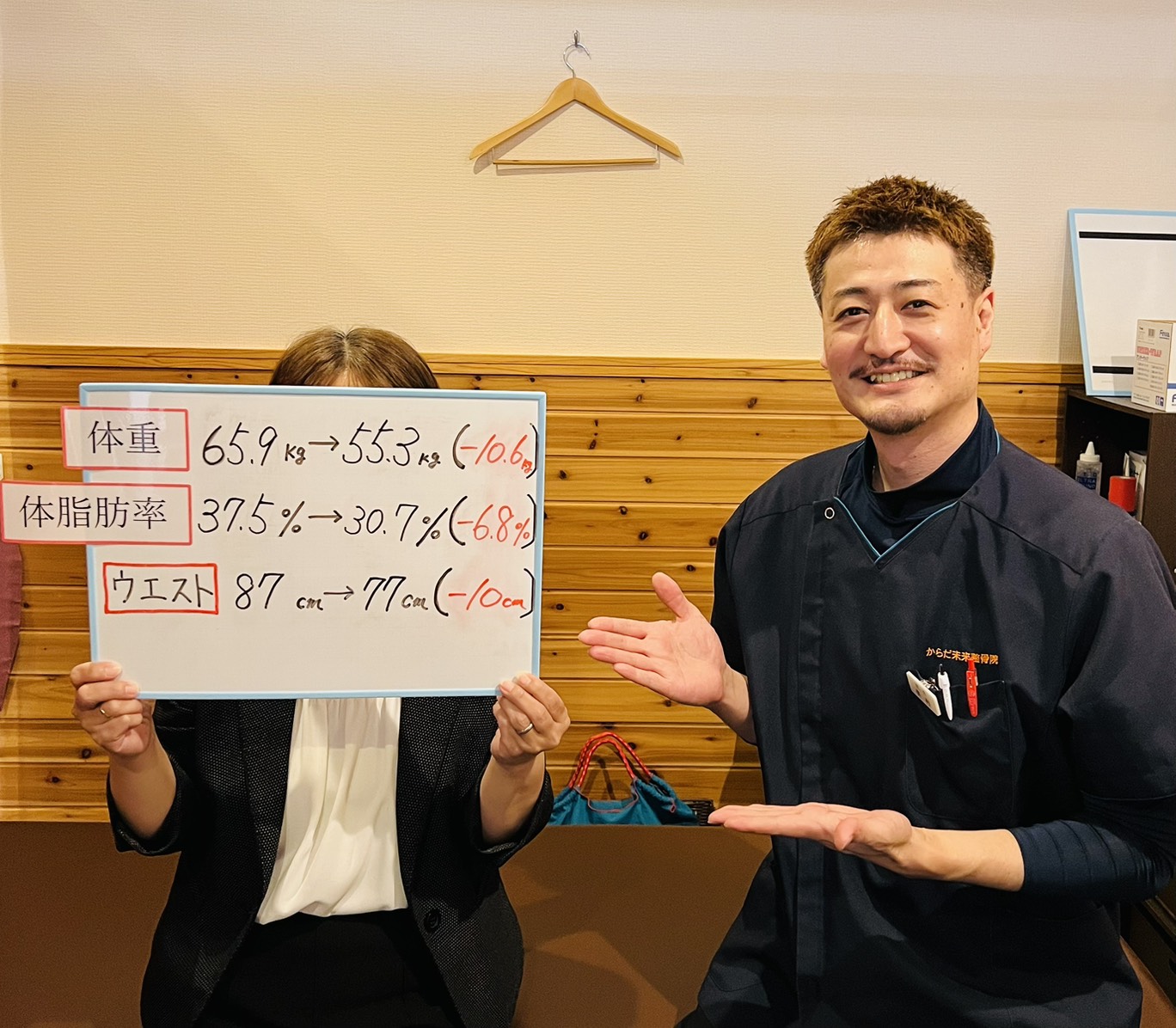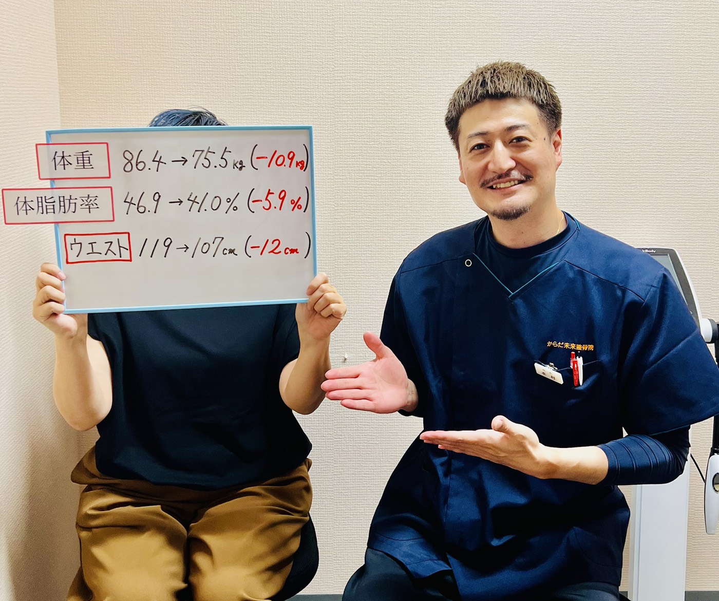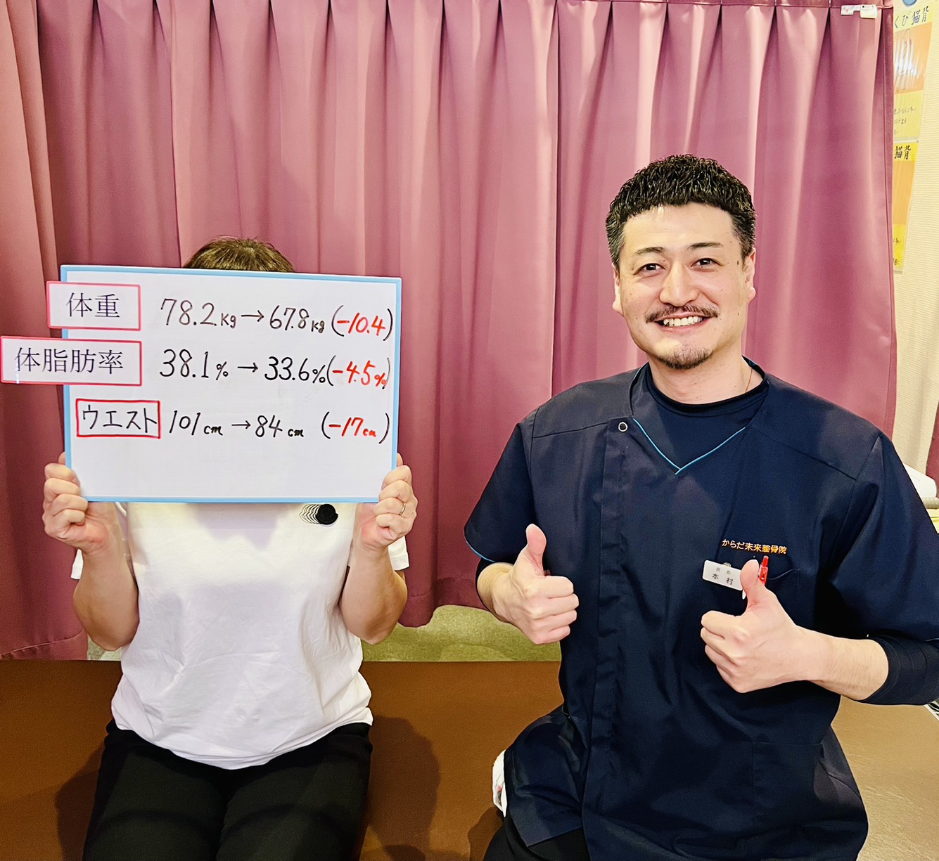 - からだ未来整骨院で過去にダイエットをした方で全く体重が落ちなかった方はいませんのでご安心ください。体重の減り方には個人差がございますが、当院のスタッフが全力でサポート致します。
